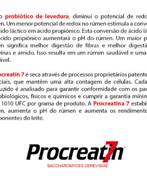 A Procreatin 7 é seca através de processos proprietários patenteados especiais, que mantêm uma alta contagem de células. Cada lote produzido é analisado para garantir conformidade com os padrões microbiológicos, físicos e químicos e cumprir a garantia mínima de 1,5 x 1010 UFC por grama de produto. A Procreatina 7 estabiliza o rúmen, aumenta o pH do rúmen e aumenta os rendimentos de componentes do leite.